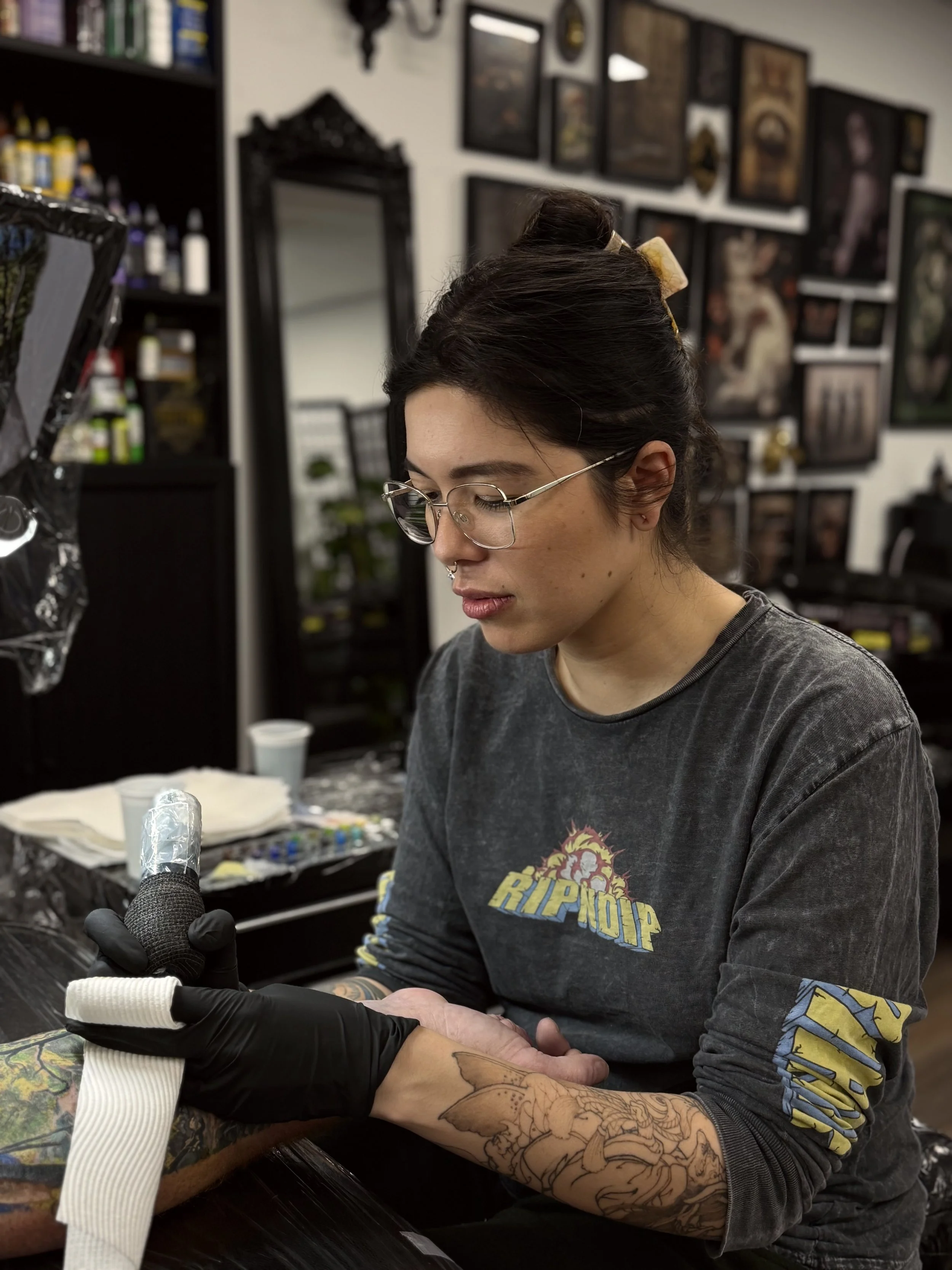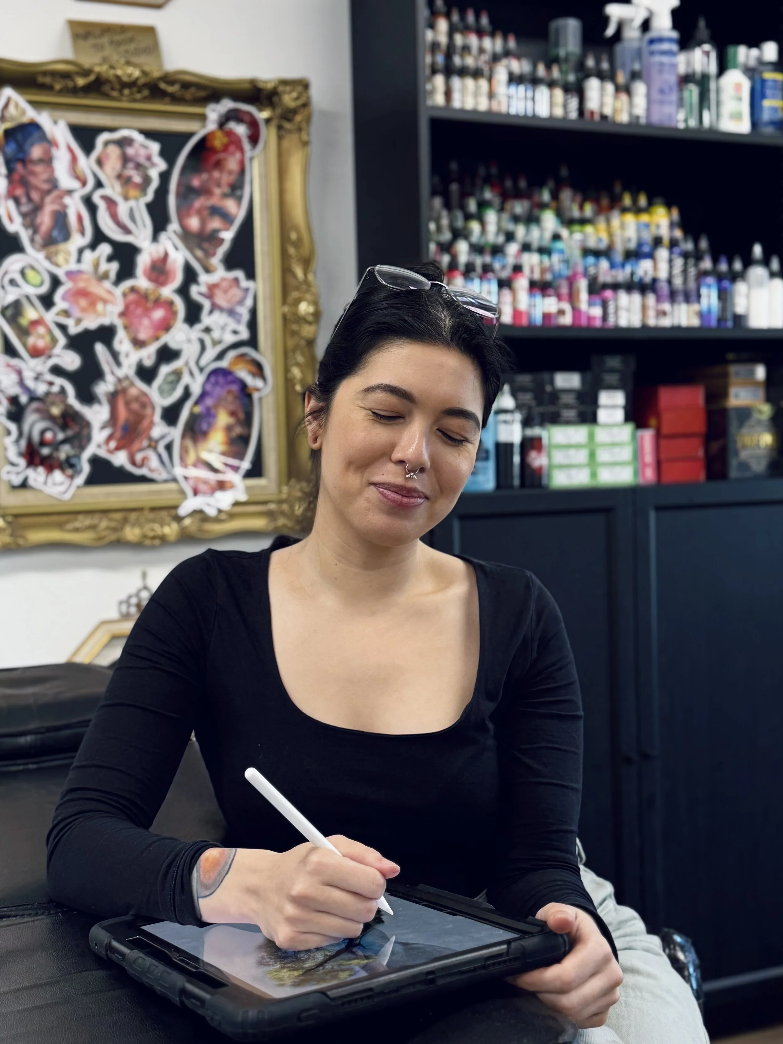 Over the years she has refined her skills, cultivating a particular passion for intricate, expressive, and impactful tattoos. With an eye for detail, she blends a rich, diverse color palette to create tattoos that are not only realistic but also radiate a painterly quality, marked by bold saturation and striking vibrancy.